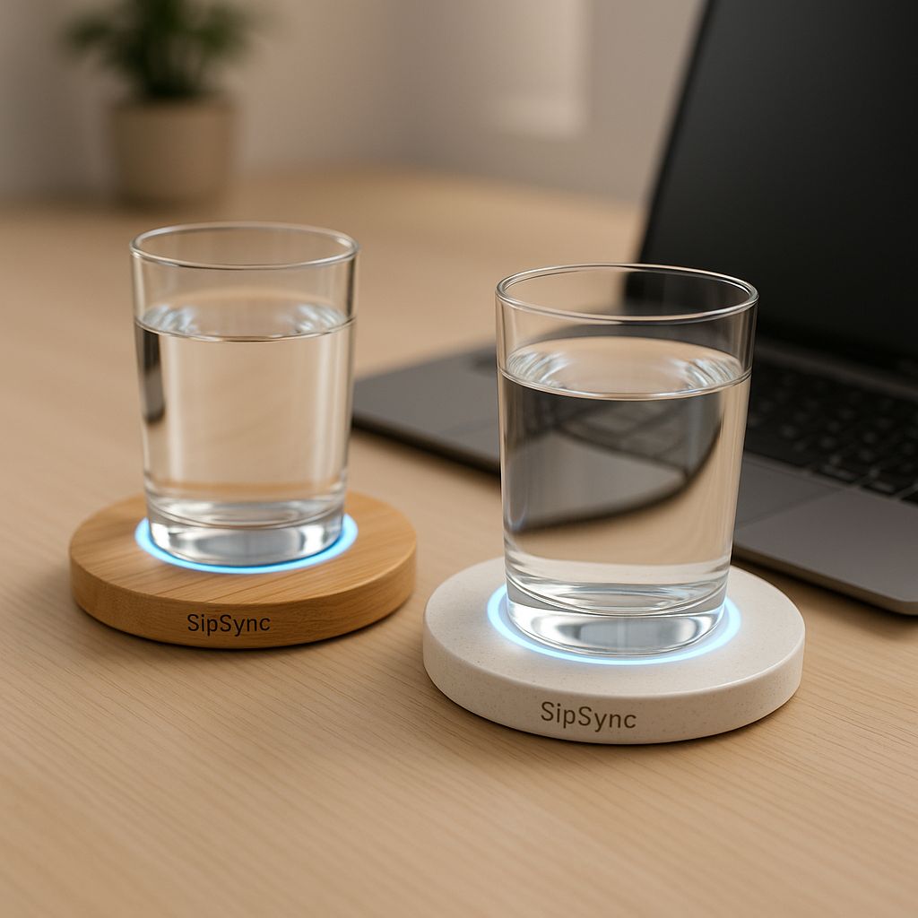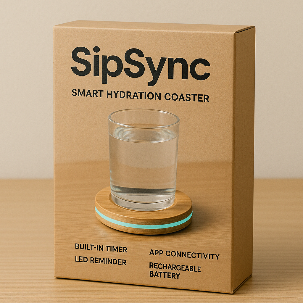 A sleek, 4-inch diameter coaster with a built-in timer and LED ring that reminds users to drink water every 30 minutes during work hours. Place any cup or bottle on it, and it tracks weight to detect sips, flashing gently if you haven’t hydrated. It syncs to a simple app for optional stats but works standalone with a single button to set work hours. Powered by a USB-C rechargeable battery, it’s made of bamboo or recycled plastic for a premium, eco-friendly look. SipSync turns hydration—a common office oversight—into a gamified, Pomodoro-like habit. The coaster’s dual role as a functional and motivational tool is unique.